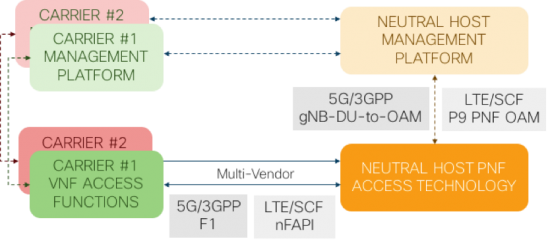 Appreciating that in the same timeframe we have seen progress in terms of 5G split architectures. 3GPP has defined the F1 split between the gNB-Centralized Unit implementing RRC/PDCP and the gNB-Distrubuted Unit implementing RLC/MAC/PHY layers. This split, together with a separate OAM management approach for the gNB-DU “PNF”, are both aimed at supporting multi-vendor interoperability. Importantly, we can now see some top level architectural alignment between these different approaches, with both nFAPI and F1 splits looking able to support neutral host deployment.