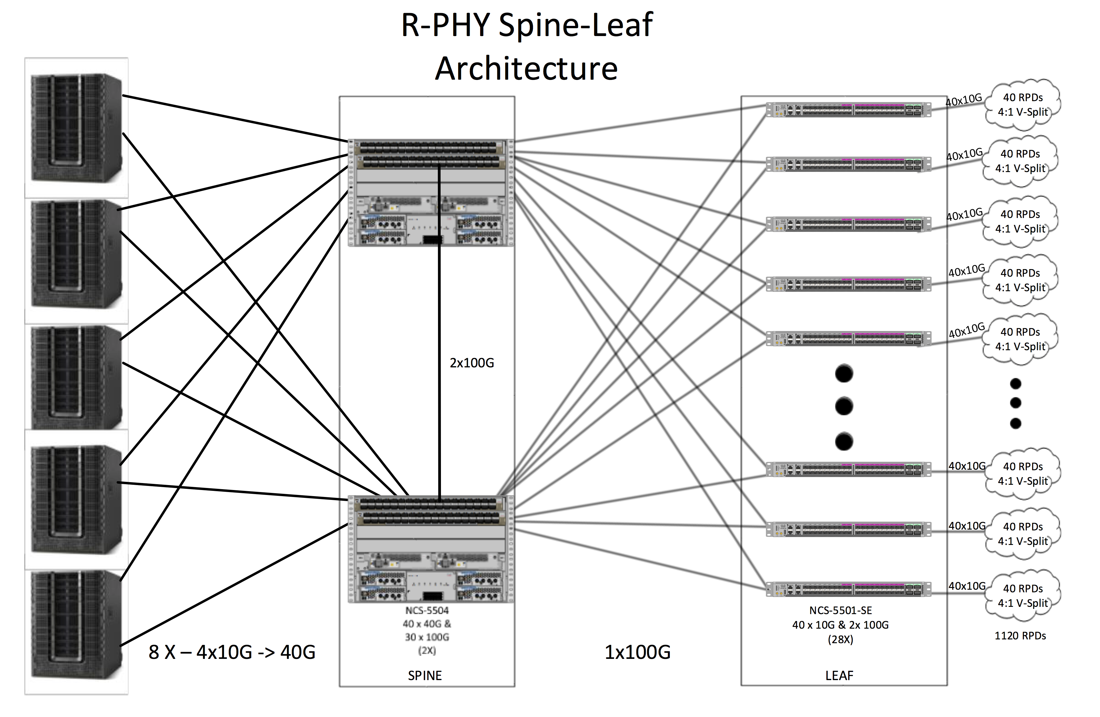The particular use-case for the spine-leaf architecture for the R-PHY CIN is to optimize east-west traffic. Since the CCAP cores predominately communicate with RPDs and vice-versa, both of these elements are part of a common spine-leaf construct. There will be a minimal amount of control plane and management traffic that will be north-south bound, but the amount will be trivial in nature in most deployments. This unique characteristic provides a way to optimize spine-leaf topology to be suited for the R-PHY CIN. Example Topology: