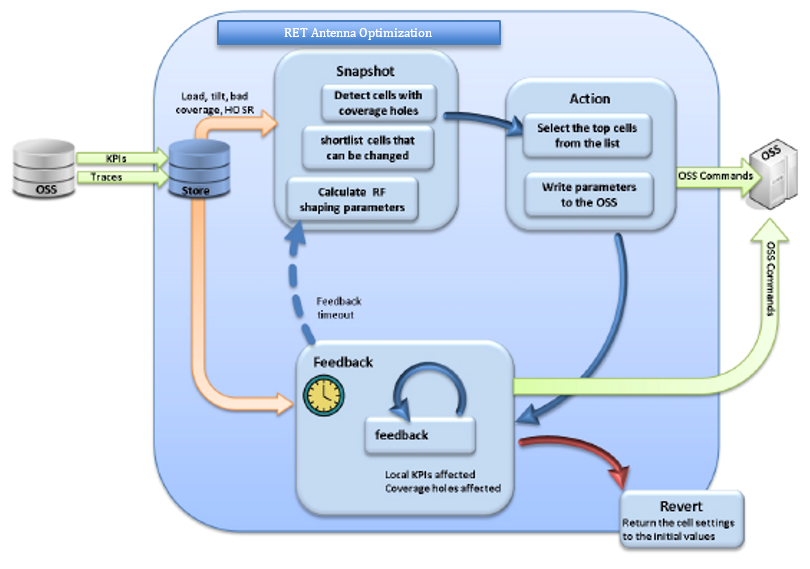 Automating RET antenna optimization gives the RF engineer a tremendous boost of productivity. The Cisco SON solution can monitor all RET equipped cells, identify interfering cells or coverage holes, then automatically down-tilt to reduce interference or up-tilt to solve coverage holes. A feedback loop verifies the KPI improvements on the tilted cell, as well as on the surrounding cells, and reverts the tilt if there is degradation in performance.