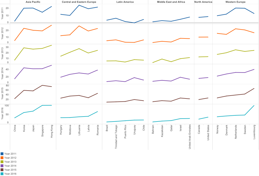 Nearly 300 million speed test records from over 200 countries have been analyzed based on data collected from Ookla’s speedtest.net. There has been a steady increase and growth in average fixed download speeds and average upload speeds as well better average latency performance across the board. Below is a sample set of leading countries from all regions, with increase seen in experienced average fixed download speeds from the years 2011 to 2016: