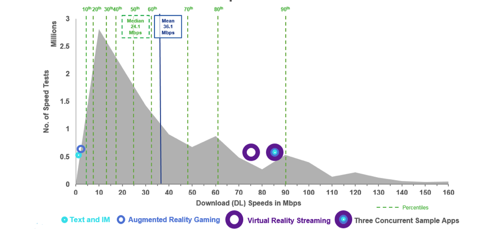 All the major trends that are much talked about this year, AR, VR, IoT, big data, analytics, rely on the end user cloud applications and readiness experience. As the plethora of IoT devices come into use, one of the measures of understanding the quality of the IoT/broadband/cloud connection is not just the average speeds and latency, but also the median speeds which is also a common descriptor of the typical broadband user’s experience in a country. We also observe an increase in median speeds over the past few years, across the board. For example, in looking at the United States’ 2016 distribution of speed tests along with a sample scenario of three applications in concurrent use and comparing it to the 2015 average and median speed test distribution along with a different sample set of three applications, the improvement from 2015 to 2016 is evident.