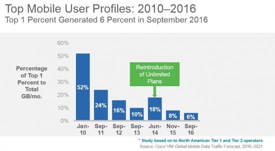 Operators have however historically managed to throttle heavy data users. As a part of the tiered pricing study within the Cisco VNI Forecast, the usage per month of the average top 1 percent of mobile data users has been steadily decreasing compared to that of overall usage. At the beginning of the 6-year study, 52 percent of the traffic was generated by the top 1 percent. With the reintroductions and promotions of unlimited plans by tier 2 operators in the study, the top 1 percent generated 18 percent of the overall traffic per month by June 2014. By September 2016, just 6 percent of the traffic was generated by the top 1 percent of users, showing that operators managed to mitigate the increase in traffic generated by the top 1 percent users.