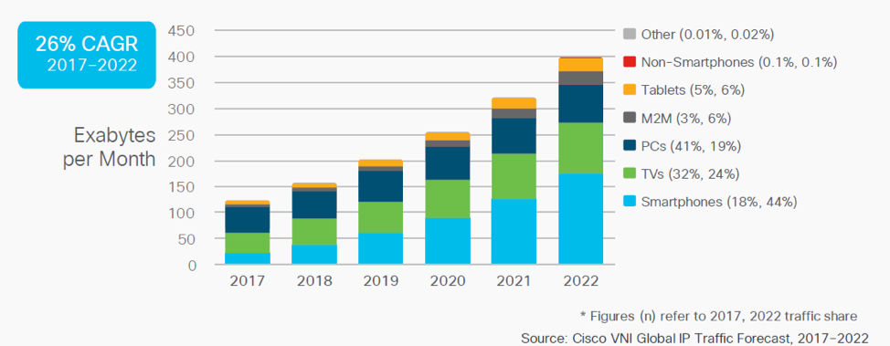 The chart in Figure 1 shows how the changing mix of devices and connections will affect traffic growth.