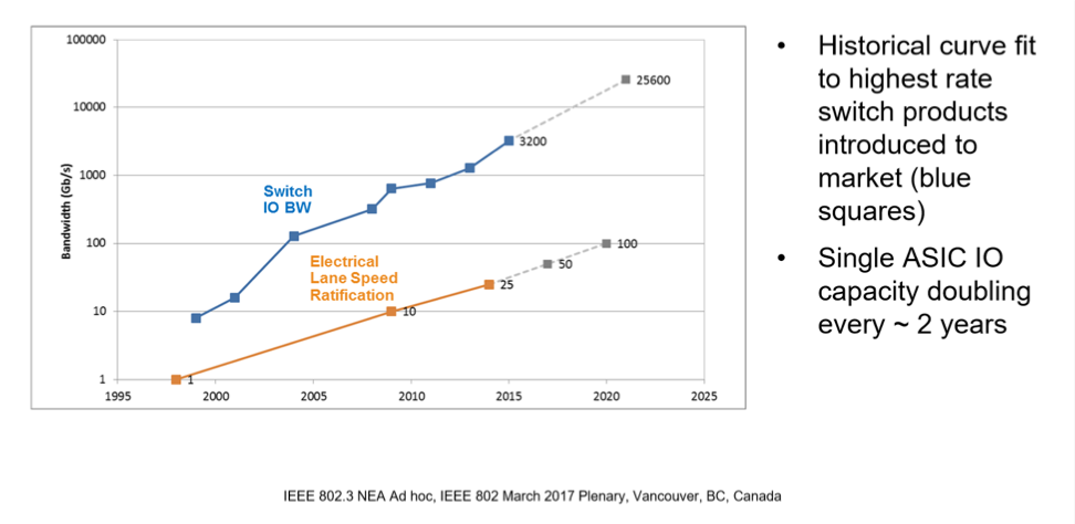 Choices made in the specifications will take into account not only form factor, but also the progression of technology on the switch/router side. Back in 2017, the IEEE forecasted that switch/router ASIC SERDES speeds will eventually increase to 100Gb/s. In Figure 2, a 100Gb/s lane rate is anticipated to be required for switch bandwidths of 25Tb/s. Currently the IEEE 802.3ck Task Force is working on 100Gb/s SERDES requirements and is scheduled to complete the specification in 2021.