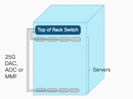 Cisco’s 25G transceiver choices include 25G Copper DAC (Direct Attached Cables), 25G AOC (Active Optical Cables) and 25G SR-S (Short Reach) transceivers.