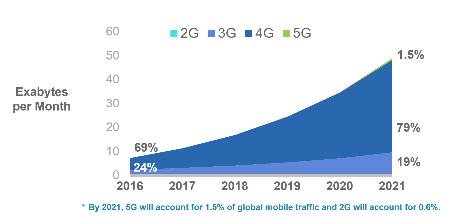 By 2021, 5G will still have a very modest share of mobile connections – 0.2 percent, or 25 million. However, each 5G connection will generate nearly 30 gigabytes per month per connection in 2021, an amount that is 4.7 times higher than the average 4G connection. In aggregate, 5G will represent 1.5 percent of total traffic by 2021 despite the low connection share.