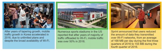 It appears that when mobile pricing conditions are right, traffic will migrate back onto cellular networks from Wi-Fi, even when Wi-Fi might be available. In Korea, unlimited plans led to an acceleration of mobile traffic and a deceleration of mobile offload onto Wi-Fi. The surprise here is that this “reverse migration” occurred despite the fact that Wi-Fi is highly available in Korea both in the home and in public locations. Likewise, there were examples of reverse migration in the US with Sprint reporting a decrease in offload rates, and with a number of sports stadiums experiencing more mobile than Wi-Fi traffic for the first time in several years. At sports stadiums, the drivers of mobile were the increase in mobile quality and speeds associated with 4G. For Sprint, the driver of decreased Wi-Fi was the availability of unlimited data plans.