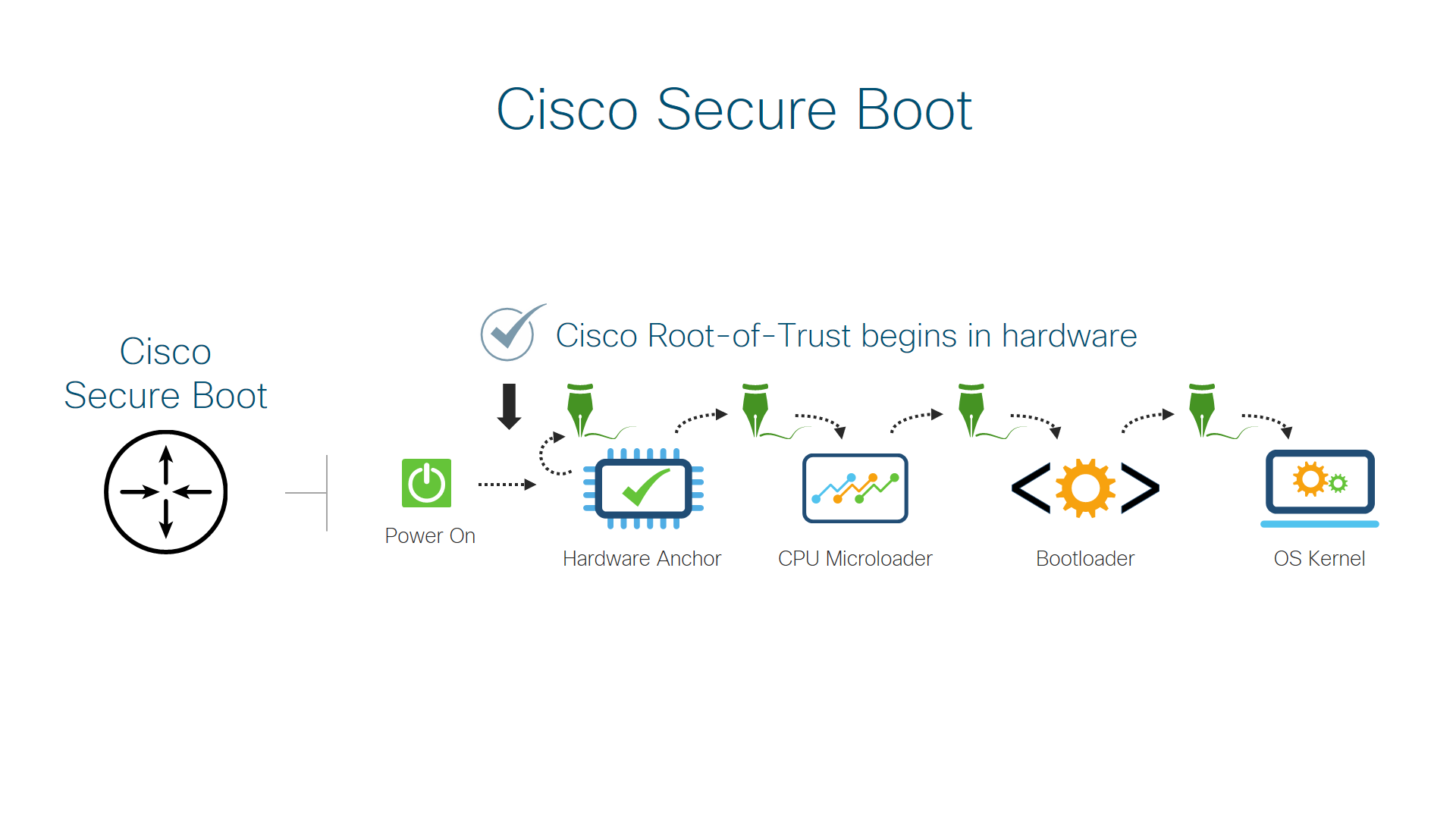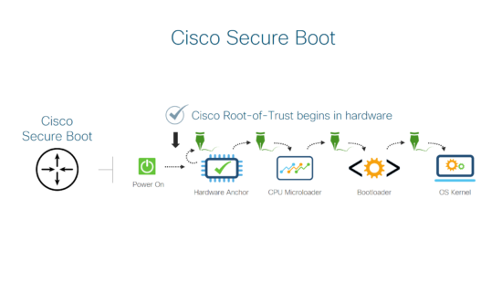 Cisco Secure Boot is based on hardware built into Cisco devices. It controls the CPU, measuring itself and establishing a hardware root-of-trust before the CPU is enabled, and before the bootloader and OS are executed. And it maintains a continuous chain-of-trust from hardware to the OS boot.