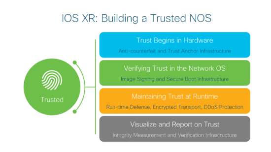 Cisco has built into the IOX XR a few sophisticated techniques delivered during runtime to further a defense posture and build trust. In addition to other methods, we use: