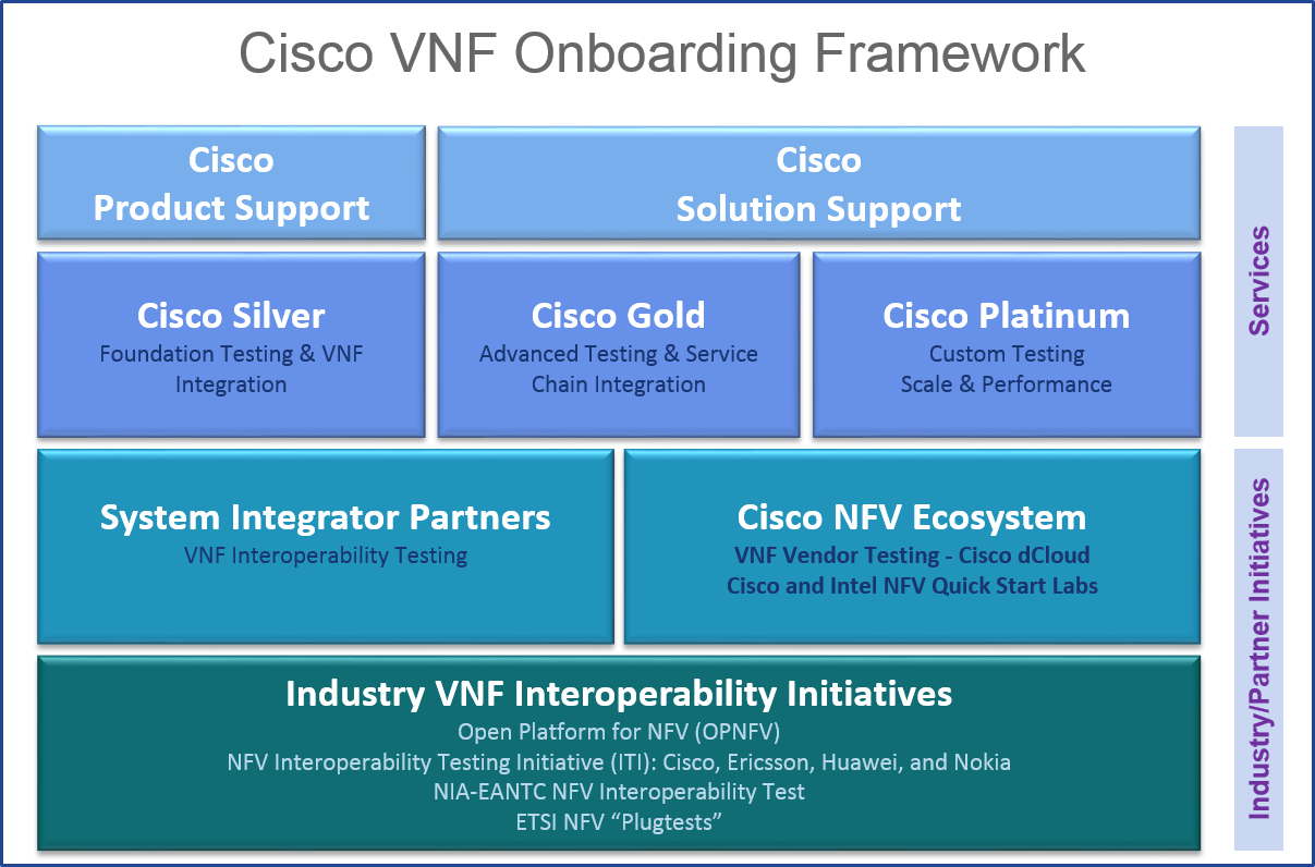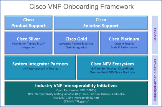 Cisco Services helps customers address these requirements. And we include service chain integration, customer-specific testing including security, large scale performance and scale testing as our customers have come to expect. These customers have very exacting “certification” or Network Ready for Use (NRFU) testing that we have worked jointly on achieving for many years. Our “Silver”, “Gold” and “Platinum” levels of service will test VNFs – Cisco and Third Party – to multiple level of customer-specific test specification. In the Gold and Platinum levels, Cisco’s world-leading Cisco Solution Validation Services (SVS), where we have built and tested the world’s biggest and most complex networks, are engaged by the most demanding customers. With these three levels of due diligence, coupled with continuing investment in our SVS labs, we’ll bring focus on testing software VNFs -including third party VNFs – to the same level of diligence that our customers have come to expect from our large scale hardware network testing.