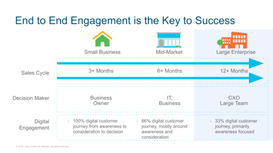 Since large enterprise buying decisions are complex and involve multiple parties, it is important to show the TSO and ROI of the solution and map it to specific business outcomes. Large enterprises are under pressure to stop buying the next shiny new object and are looking for solutions that truly drive business outcomes and productivity gains in a tangible, measurable manner.