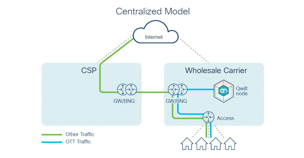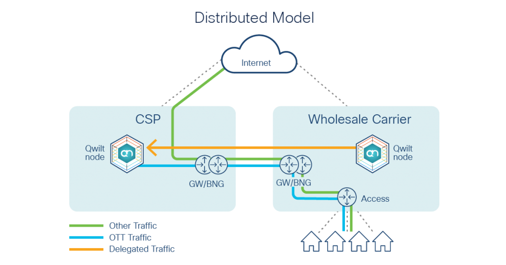 In a distributed model, the caching nodes could be deployed in the CSP’s environment as a managed service, where the wholesale carrier (in partnership with Qwilt) takes responsibility for the lifecycle management of those nodes. The distributed model in effect is a miniature of the broader Cisco/Qwilt CDN architecture. The content publishers delegate traffic to the Qwilt nodes supported by Cisco in the wholesale carrier’s network. Similarly, the Qwilt nodes in the wholesale carrier’s network will delegate traffic to the open caching nodes that would be deployed in the CSP’s network.
