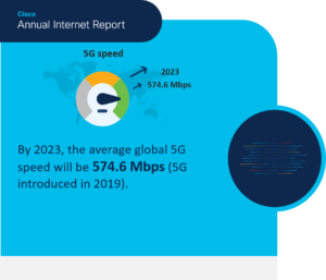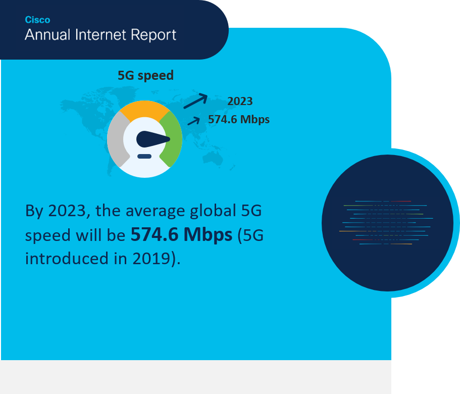 The need for the speed at which many of these applications need to be delivered is more important than ever. As a symbolic proof point, a leading mobile operator recently chose six-time Formula 1 racing world champion Lewis Hamilton to serve as the celebrity spokesperson launching their new 5G network. The Cisco Annual Internet Report projects that 11% of global mobile connections worldwide will be equipped with 5G capabilities and average 5G speeds will reach 575 Mbps by 2023.