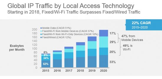 In 2015, Wi-Fi traffic was 7 times greater in volume than mobile data (cellular) traffic, though mobile data traffic does have a higher growth rate than Wi-Fi (it’s growing from a smaller base level). By 2020, Wi-Fi traffic will be about 3 times greater than mobile data traffic. And starting in 2018, Wi-Fi traffic will even surpass Fixed/Wired traffic. 63% of global mobile data traffic will be offloaded by 2021.