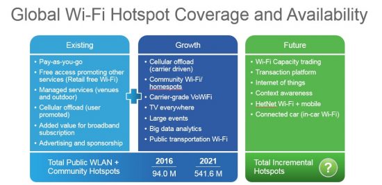 Globally, total public Wi-Fi hotspots (including homespots) will grow 6-fold from 2016 to 2021 from 94 million in 2016 to 541.6 million by 2021. From a regional perspective, APAC leads with 246 million or 45% of the global hotspots by 2021 followed by Western Europe with 23%. Leading hotspot countries are China (170M by 2021), the United States (86M by 2021), Japan (33M by 2021) and France (30M by 2021).  Homespots are a significant portion of the public Wi-Fi strategy and are emerging as a potentially significant element of the Public Wi-Fi landscape where subscribers allow part of the capacity of their residential gateway to be open to casual use. Homespots are actually home gateways that are used (upgraded) to offer home and commercial /public Wi-Fi for other users in their area by means of a second SSID. This is widely implemented and can result in substantial mobile traffic offload.
