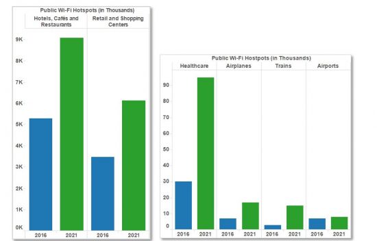 Public Wi-Fi hotspots (minus homespots) will nearly double from 8.8 million in 2016 to 15.4 million by 2021. Hotels, cafes and restaurants will have the highest number of hotspots by 2021 globally, and the fastest growth is in healthcare facilities (hospitals) where hotspots will triple over the forecast period. The primary objective of Wi-Fi in hospitals is to improve the delivery of healthcare services and staff productivity, with a secondary benefit being Internet access for patients, their families and guests.