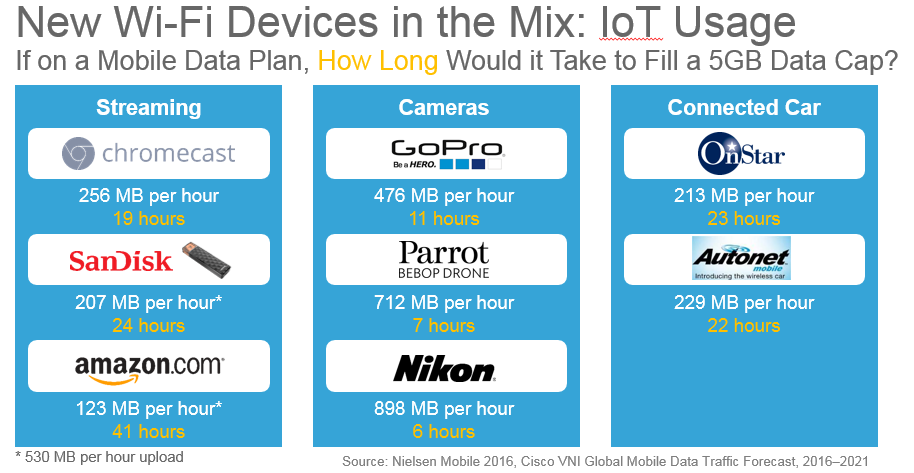 Integral to these verticals and looking into the future are the game changing IoT devices and connections. According to Maravedis/Rethink research and the WBA Alliance, more than two thirds (67%) of mobile operators and 78% of cable companies expect to use Wi-Fi to support IoT services by 2020. Wi-Fi is widely used as a mobile offload mechanism for IoT applications as well since cellular connectivity can be costly with data caps applied to most mobile data plans. Figure 5 looks at commonly used consumer IoT devices and connections, and their Wi-Fi usage. Assuming that this usage in MB per hour was on a mobile/cellular network, a common 5 GB plan for some of these devices (if used uninterruptedly) can take less than a day to fill or use up a month’s worth of allotted mobile data.