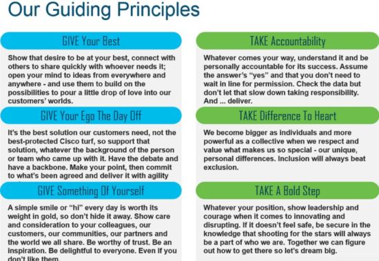I’m going to bravely bet that you are one of two people right now. You either don’t work at Cisco yet and aren’t sure what “Our Principles” are (see below) OR you do work at Cisco, and you could probably place yourself in one of three categories; skeptic, believer or evangelist.