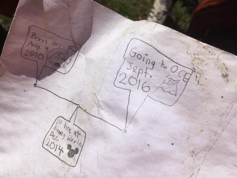Next, we find a note. A neatly folded paper etched with pencil. It is a simple drawing but a very important one. Once upon a time to a very small child at least. On it are three small squares and a line. But it tells the tale of a lifetime; one of birth, journey, future.
