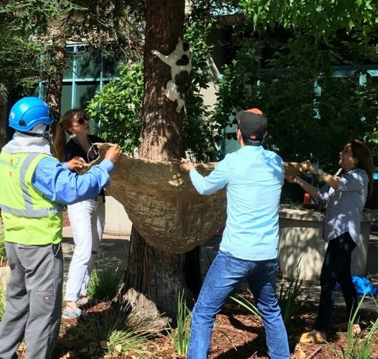Soon after, they showed up with their truck with the long arm and cab. As they were starting to get close to Spotty kitty, it panicked and starting wiggling down the tree. A group of us were worried that the cat would jump, so another employee, Nhan, took off his shirt and we wrapped it around the tree to catch Spotty in case she fell. Then the landscaper gave us an even larger sheet to ensure we covered more ground.