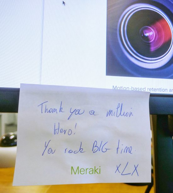 The person I said “Hello!” to was a girl named Laure, and it was her very first day here at Cisco Meraki. We got to chatting, and it turns out that she happened to be a sales rep covering part of the same area I cover in Belgium!
