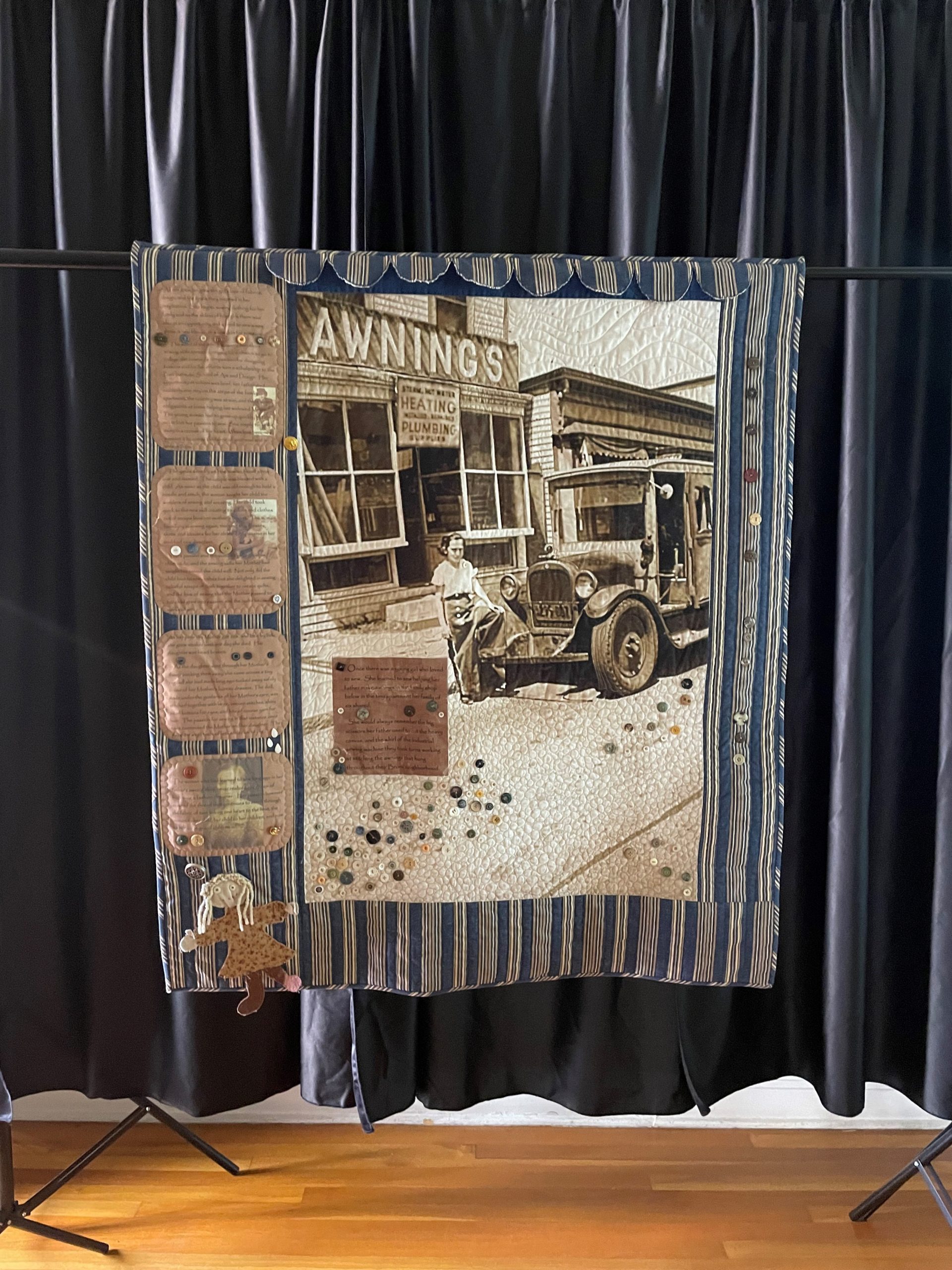 One of the art quilts she made is called “She Loved to Sew.” It has always been one of my favorite pieces. The quilt has a photo of my grandmother as a young child standing in front of my great-grandfather’s awning shop in New York. It is covered in buttons at the bottom of the quilt.
